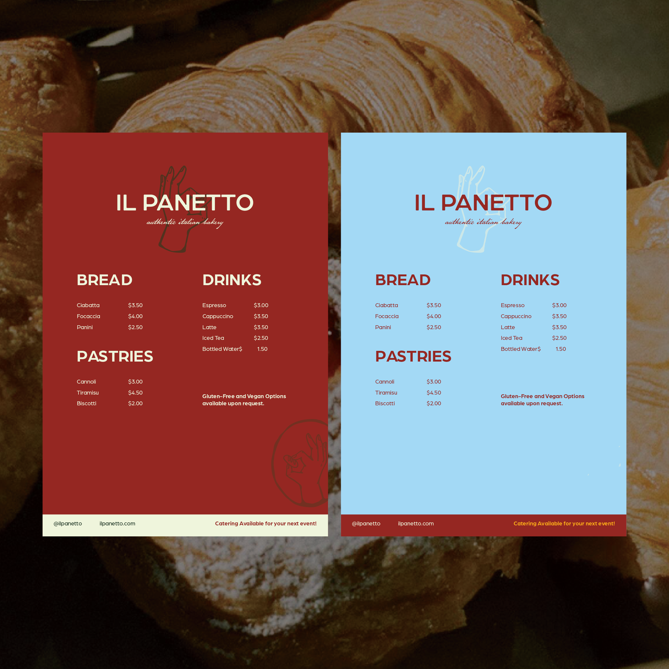 From what I’ve found, “Il Panetto” means “small loaf” in Italian so I really wanted to play into that and designed a tiny loaf held between two fingers. For typography, I opted for a sans serif font for a friendly, rustic, homey feel, pairing it with an elegant script font to elevate the brand’s personality. The colour palette includes red, white, and a refreshing light blue, inspired by Italy’s stunning beaches, offering a unique twist on traditional Italian colours.